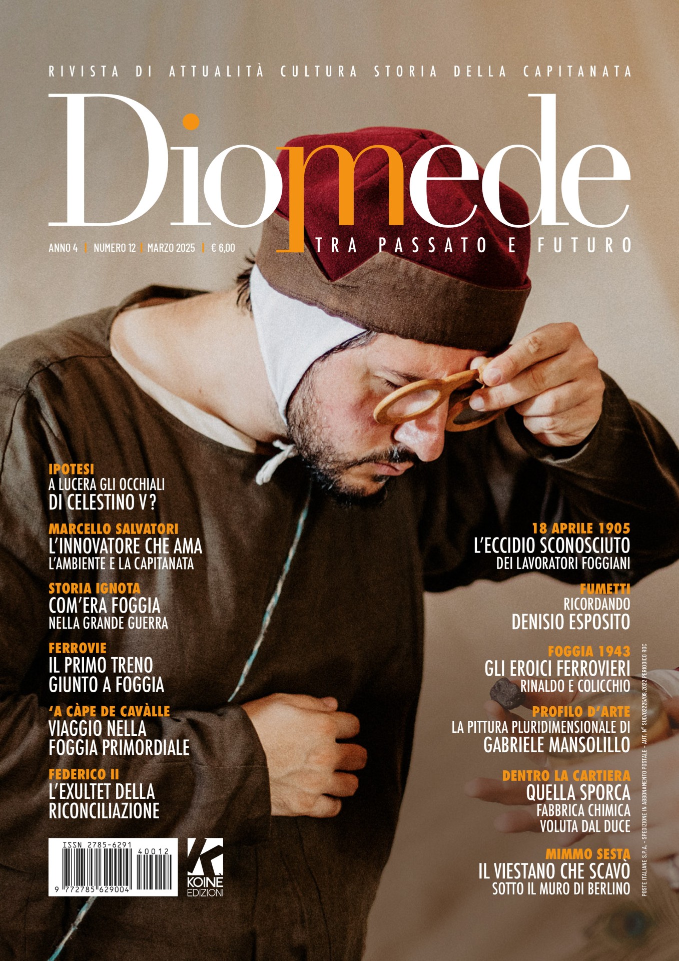 Con il numero di marzo “Diomede” si appresta a entrare nel terzo anno di vita, e si presenta con una splendida copertina di Alessandro Pavino che richiama un episodio suggestivo, come spiegato da Alessandro De Troia, e cioè la possibilità che a Lucera siano conservati gli occhiali di Celestino V, il Papa del famoso “Gran rifiuto”.